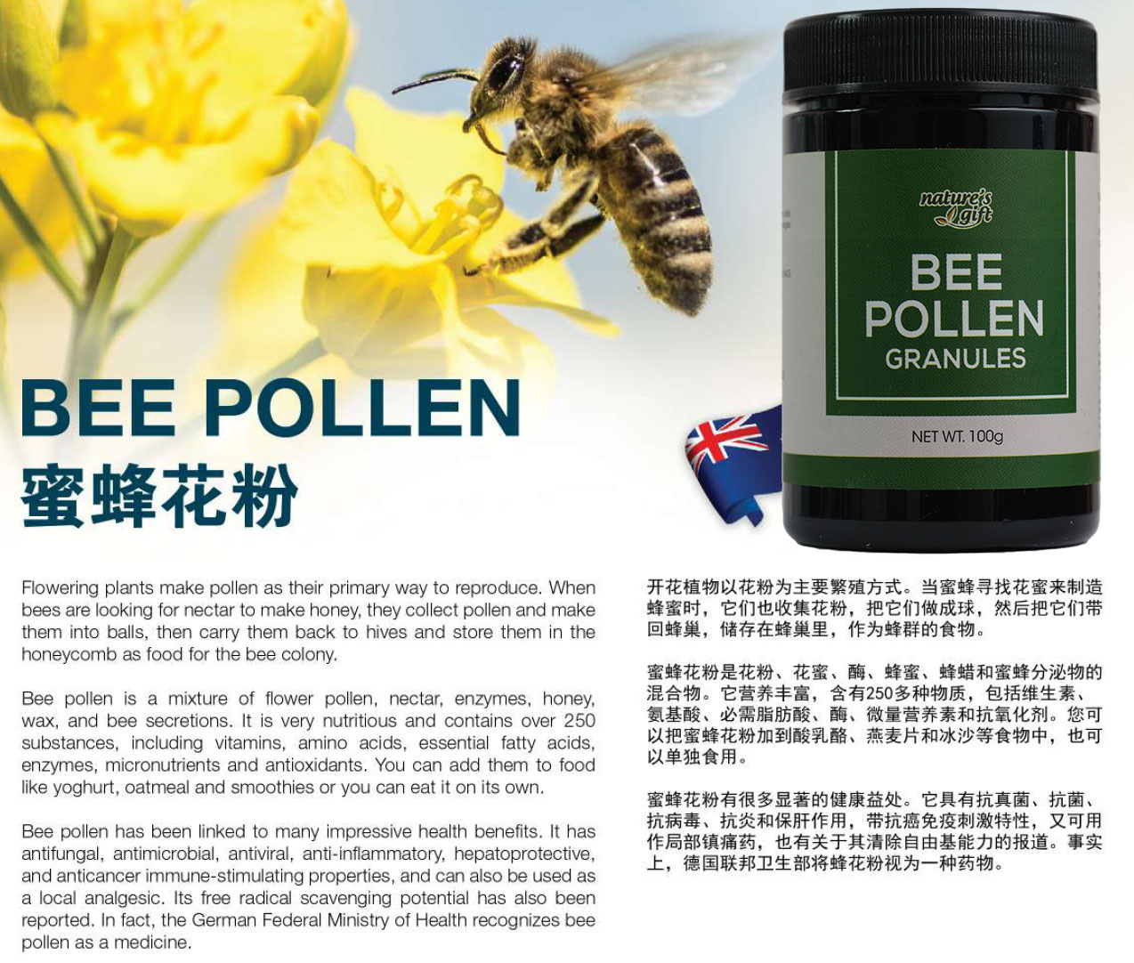Bee pollen is made from the pollen that the bee gathers from flowers. Mixing the microscopically fine powder with a little honey from her honey sac. the honeybee skillfully forms them into single golden grains or granules. When the bee returns to the hive, the pollen granules are mixed with enzymes to prevent germination and to metabolize them for food.